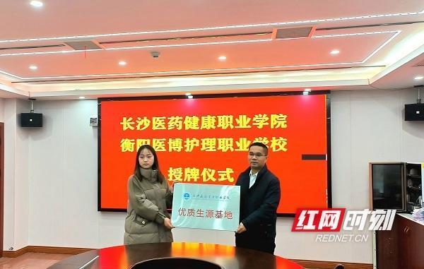 红网时刻新闻2月18日讯(记者 彭超)2月17日,长沙医药健康职业学院与衡阳医博护理职业学校举行“优质生源基地”授牌仪式。双方将携手共进,为社会培养优秀医药健康人才。长沙医药健康职业学院副校长曹永彪代表长沙医药健康职业学院授牌,衡阳医博护理职业学校副校长肖慧容接受牌匾。长沙医药健康职业学院理事长丁志强、副校长曹淑媛,衡阳医博护理职业学校党支部书记邱庆斌,副校长屈国峰,团委书记李琳出席授牌仪式。一直以来,长沙医药健康职业学院秉持“厚德精医、仁术康民”的校训,致力于培养具有高尚医德、精湛医术和良好人文素养的医药健康人才。学院占地面积广阔,规划面积达1880亩,目前占地面积1250亩,建筑面积27万平方米。拥有现代化的教学、生活设施,数字化智慧校园建设走在前列。同时,学院构建了覆盖医药全产业链的五大特色学院,开设15个热门专业,涵盖医药卫生、大健康服务及其相关产业多个领域。多年来,衡阳医博护理职业学校在职业教育领域深耕细作,有着丰富的教学经验和优秀的教学成果。学校坚持以市场需求为导向,以培养高素质实用型人才为目标,为社会输送了大量优秀的专业技术人才。此次优质生源基地的建立,是双方优势互补、资源共享的有益尝试。对于衡阳医博护理职业学校的学子来说,这意味着他们将有更广阔的发展空间和更明确的升学方向。而长沙医药健康职业学院也将借此契机,吸引更多优秀的生源,为医药健康事业注入新的活力。未来,两校将在教学资源共享、师资队伍建设、学生培养等方面展开深入合作,共同探索人才培养的新模式、新方法,为湖南乃至全国的医药健康事业培养出更多具有国际竞争力的高素质人才,共同书写医药健康事业的美好篇章。2月18日,长沙医药健康职业学院还为株洲求实职业技术学校授予了“优质生源基地”牌匾。举报/反馈